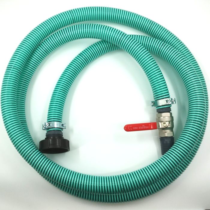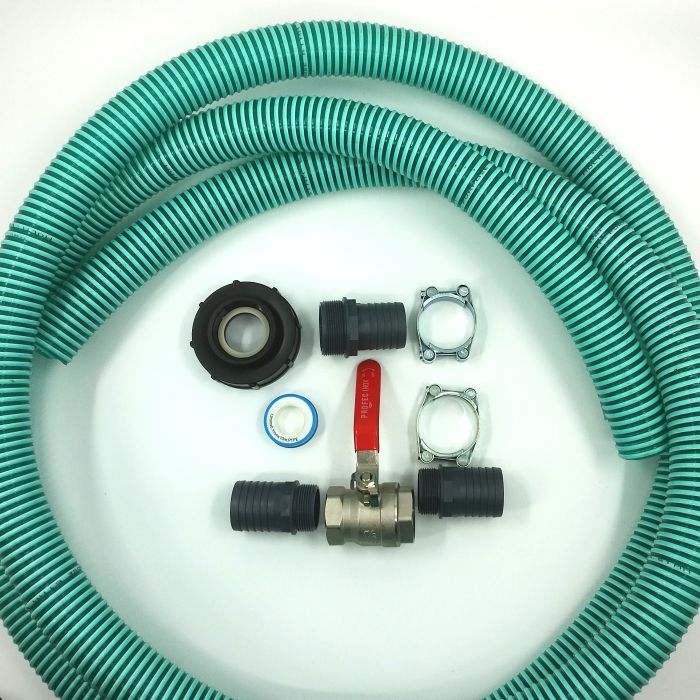 Kraftig aftapningssæt med 51mm spiralslange. Til IBC palletanke. 3" ekstra kraftig adapter.  Slangen er 4 meter lang med 1 1/2" messing kuglehane.
