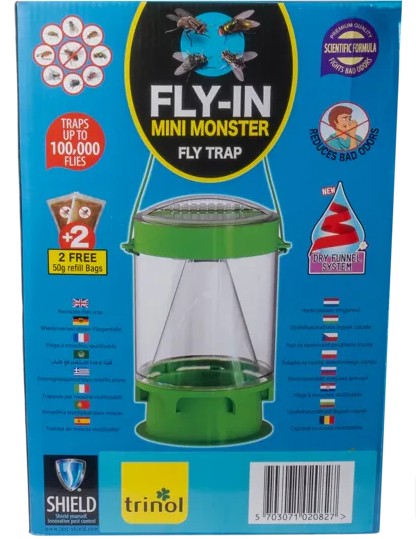 Fluefælde til udendørs brug på terrasser, indgange og ved husdyrhold, såsom grise, køer, heste og høns. Det anbefales at hænge fælden 6-7 meter fra indgange, og 7-8 meter fra terrasser og opholdsområder. Fælden kan også anvendes nær kompost- og affaldscontainere. Fly-In Mini Monster fluefælden kan fange op til 100.000 fluer.