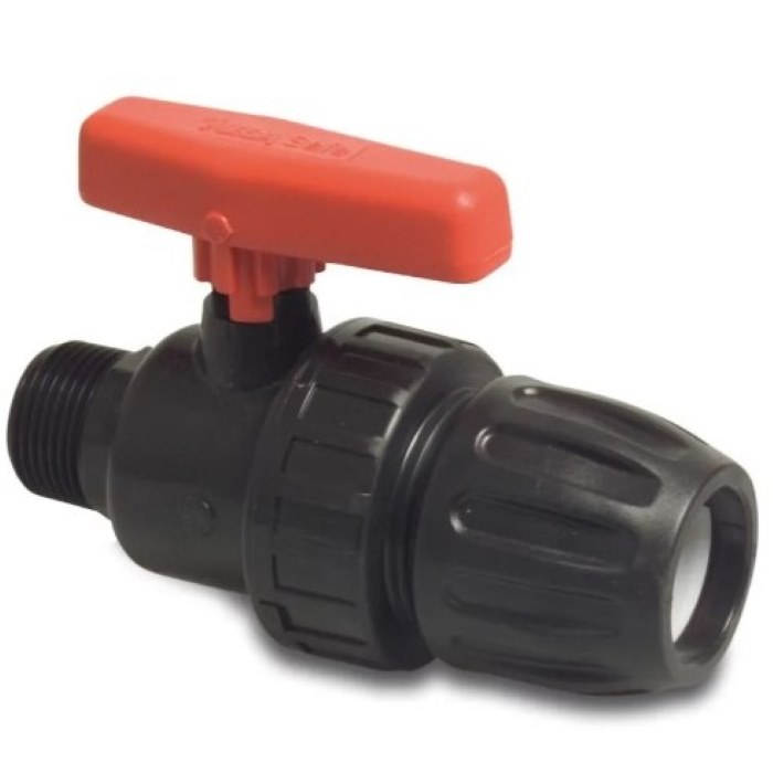 Profec kugleventiler til PEL rør og slanger. Spændfitting x Udvendigt og indvendigt gevind i mange størrelser. Velegnet til vandingsanlæg
