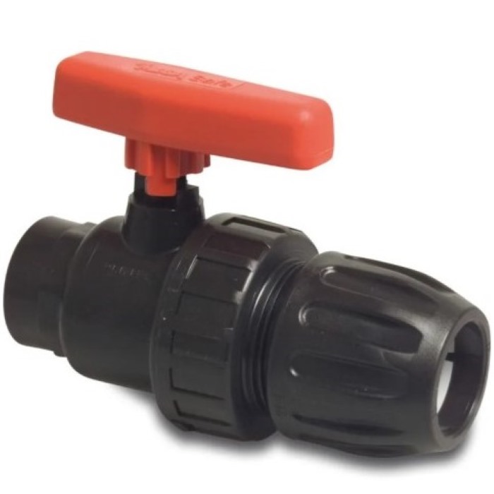 Profec kugleventiler til PEL rør og slanger. Spændfitting x Udvendigt og indvendigt gevind i mange størrelser. Velegnet til vandingsanlæg
