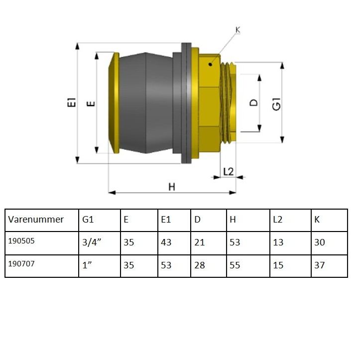 Push-in tank gennemføring i messing fåes i størrelserne 3/4" 0g 1" udvendig gevind.