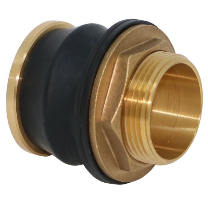 Push-in tank gennemføring i messing med NBR pakning fåes med 1" udvendig gevind.
