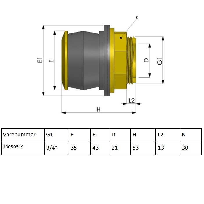 Push-in tank gennemføring i messing. NBR pakning. 3/4" Udv. gevind
